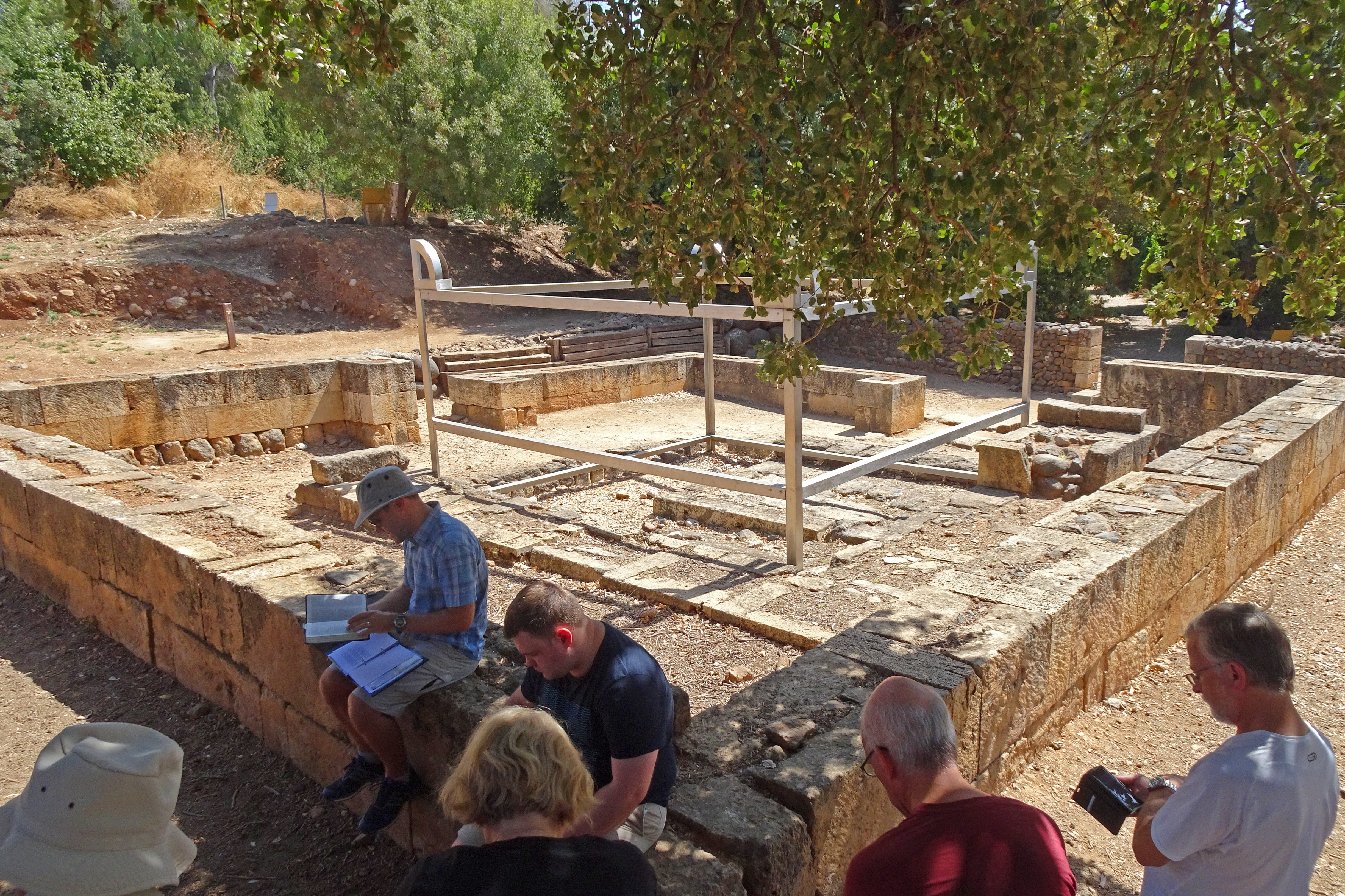 Reading our Bibles at the ruins of the site of the golden calf at Dan |