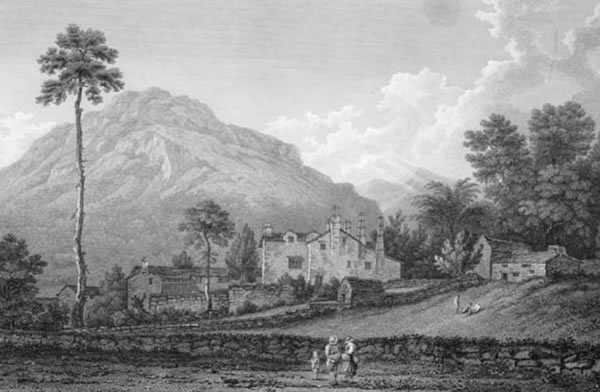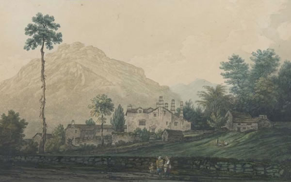 Gray's Journal Entry: ‘The village of Patterdale is situated near the head of Ullswater. It lies in a cove of mountains open in front to the southern reach of the lake. The building that forms the principal object in this view we have called the Palace of Patterdale, leaving the nature of its claim to that appellation to be explained by the following passage in Mr Gilpin’s Observations on the Mountains and Lakes of Cumberland and Westmorland. “Among the cottages of this village, there is a house, belonging to a person of somewhat better condition; whose little estate, which he occupies himself, lies in the neighbourhood. As his property, inconsiderable as it is, is better than that of any of his neighbours, it has gained him the title of King of Patterdale, in which his family name is lost. His ancestors have long enjoyed the title before him. We had the honour of seeing this prince, as he took the diversion of fishing on the lake; and I could not help thinking, that if I were inclined to envy the situation of any potentate of Europe, it would be that of the King of Patterdale. The pride of Windsor or Versailles would shrink in a comparison with the magnificence of his Dominions.”’ |